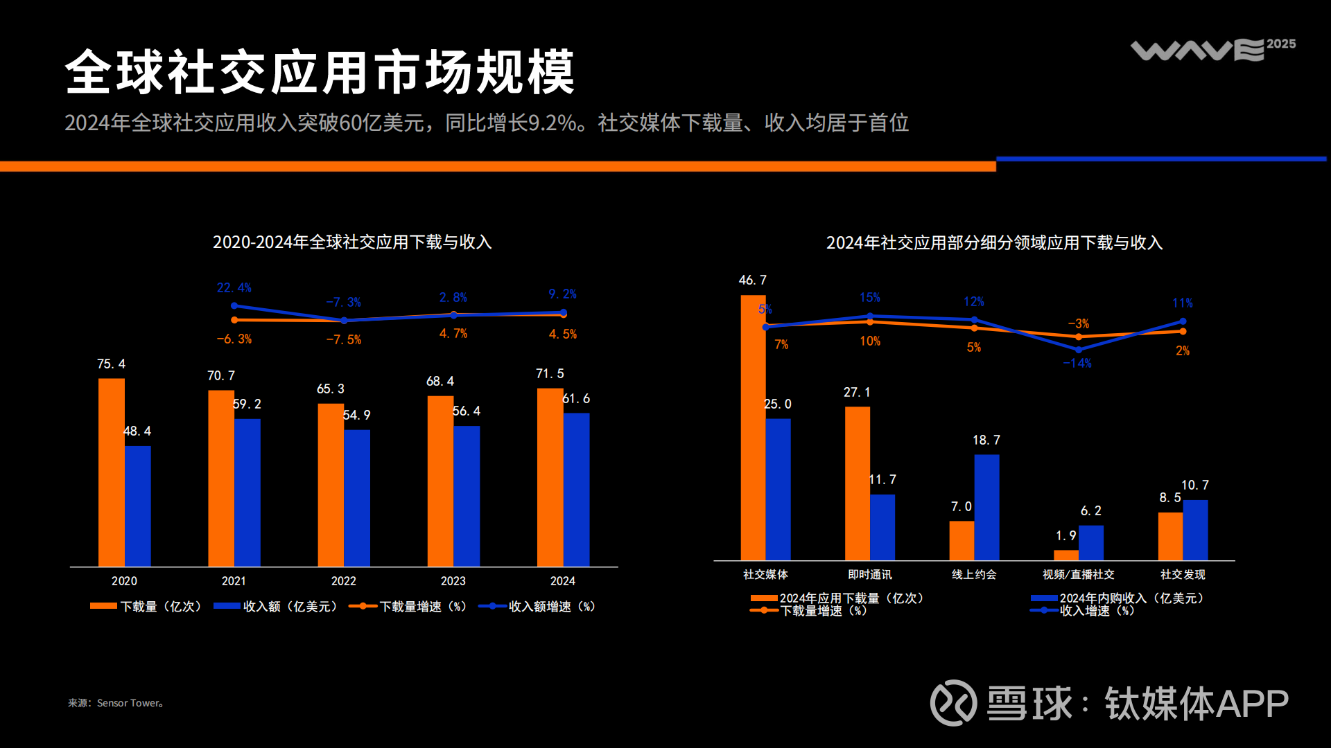 国内社交市场已进入成熟的存量竞争阶段,而海外的增量空间仍然十分可观。2024年,全球社交应用收入突破60亿美元,同比增速达9.2%。从下载量来看,社交媒体以8.55亿次的下载居于首位;而从应用收入上来看,线上约会狂揽25.73亿美元的收入,堪称一骑绝尘。