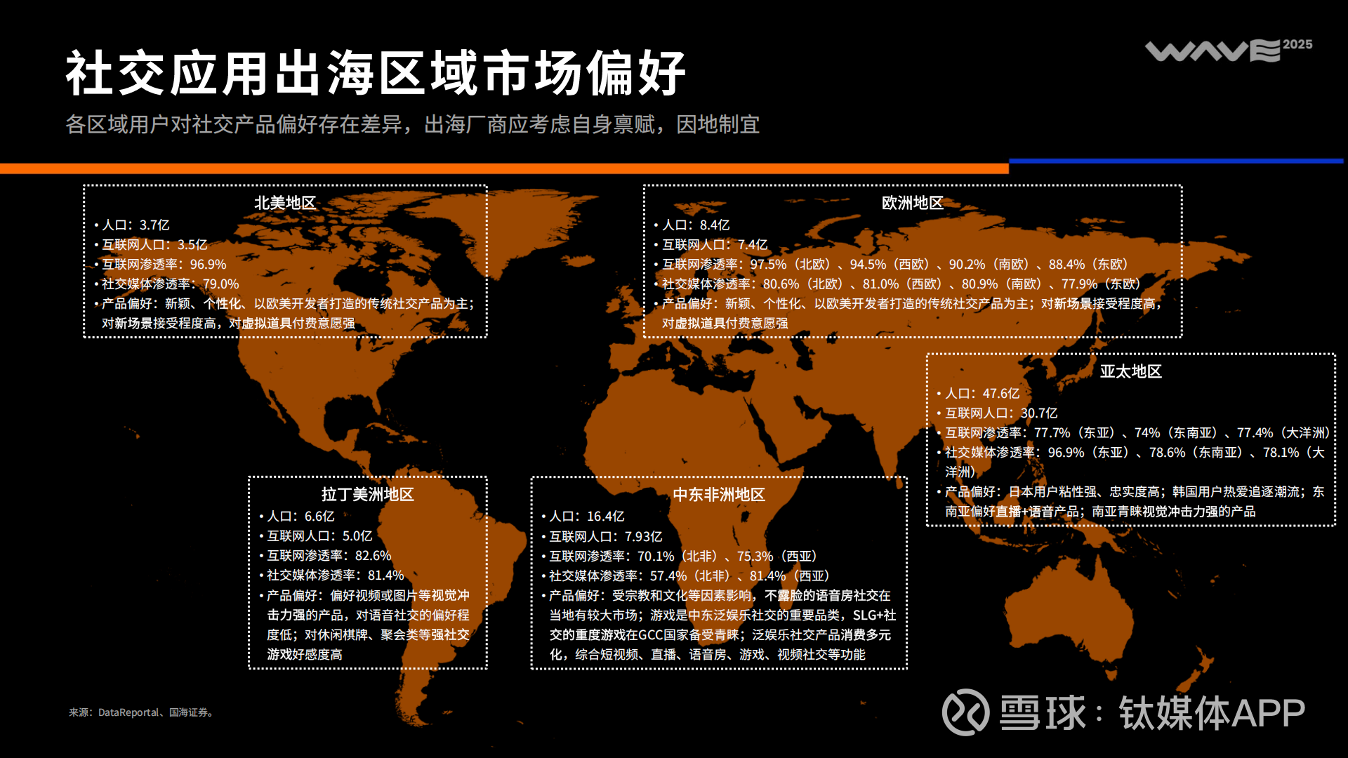 那从社交应用出海路径上来看,欧洲、北美、亚太、拉美、中东北非五大区域的产品偏好也是各有不同,这对出海厂商来说,应结合自身的禀赋优势,因地制宜推出产品。
