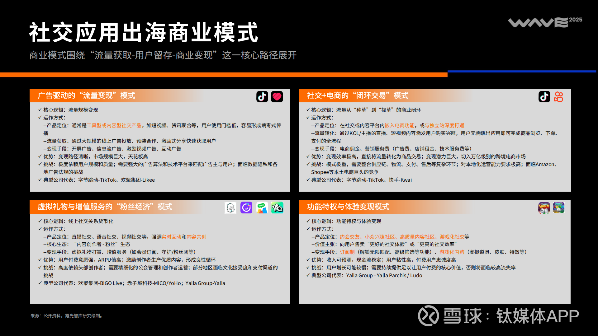 从社交应用出海商业模式上来看,目前主要是围绕“流量获取-用户留存-商业变现”这一核心路径展开的。广告、电商、打赏、功能特权与体验等是主要的变现模式。