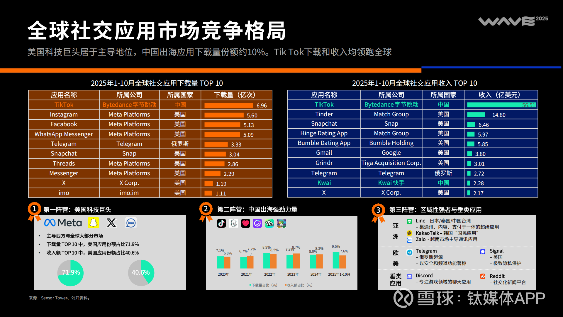 从全球社交应用市场竞争格局上来讲,中国、美国已经处于第一梯队;除此之外,还有在日本、泰国、韩国等地区的区域性强者与垂类应用,也表现亮眼。