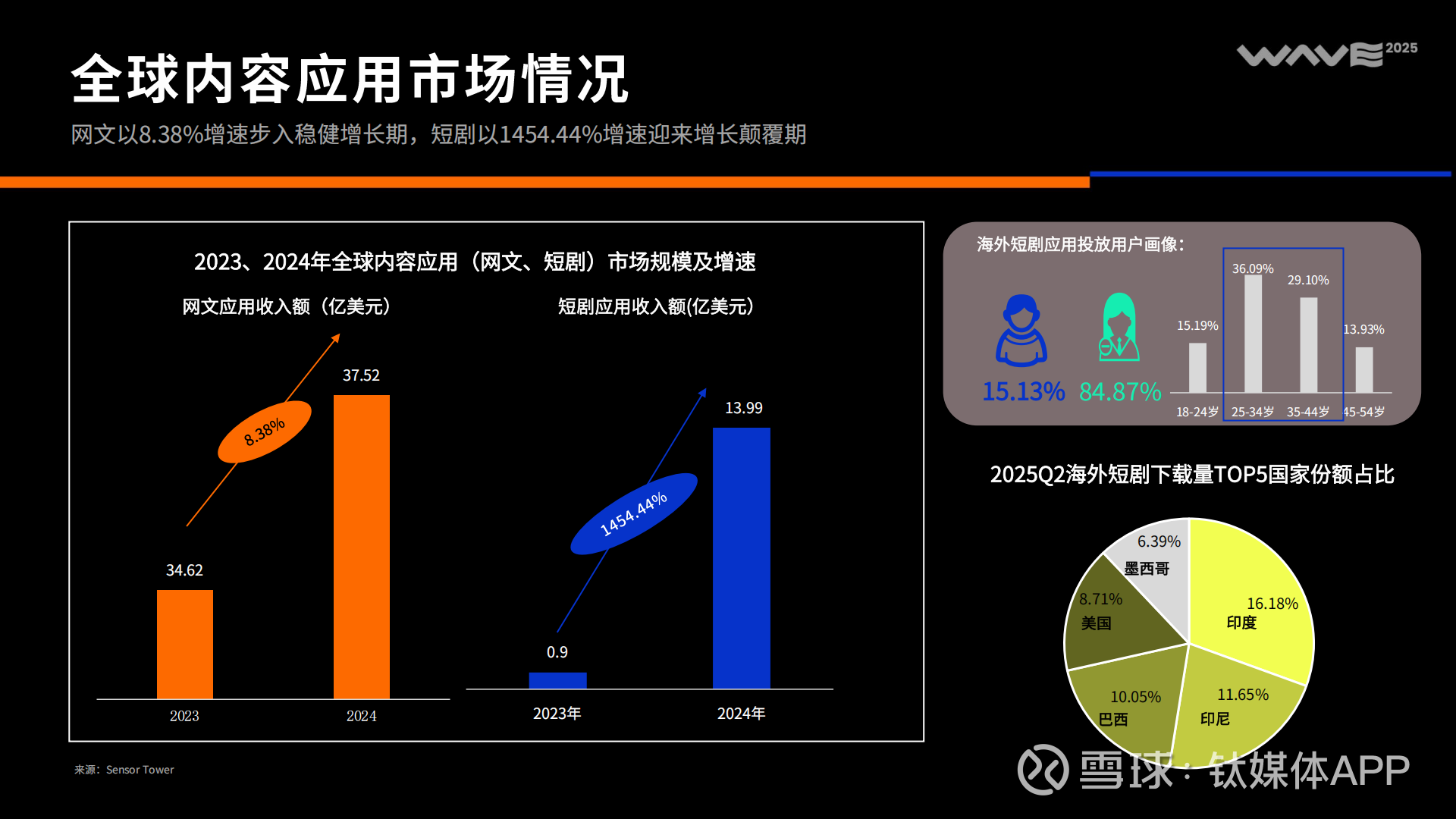 首先从整体市场状况上来看,去年短剧应用收入同比增长1454.44%,可见增长已经呈爆发式。当然从体量上看还达不到网文应用的收入规模。从海外短剧应用投放用户画像上来看,25-44岁女性是短剧的主要用户;印度、印尼、巴西、美国、墨西哥,是下载量位列前五的海外市场。