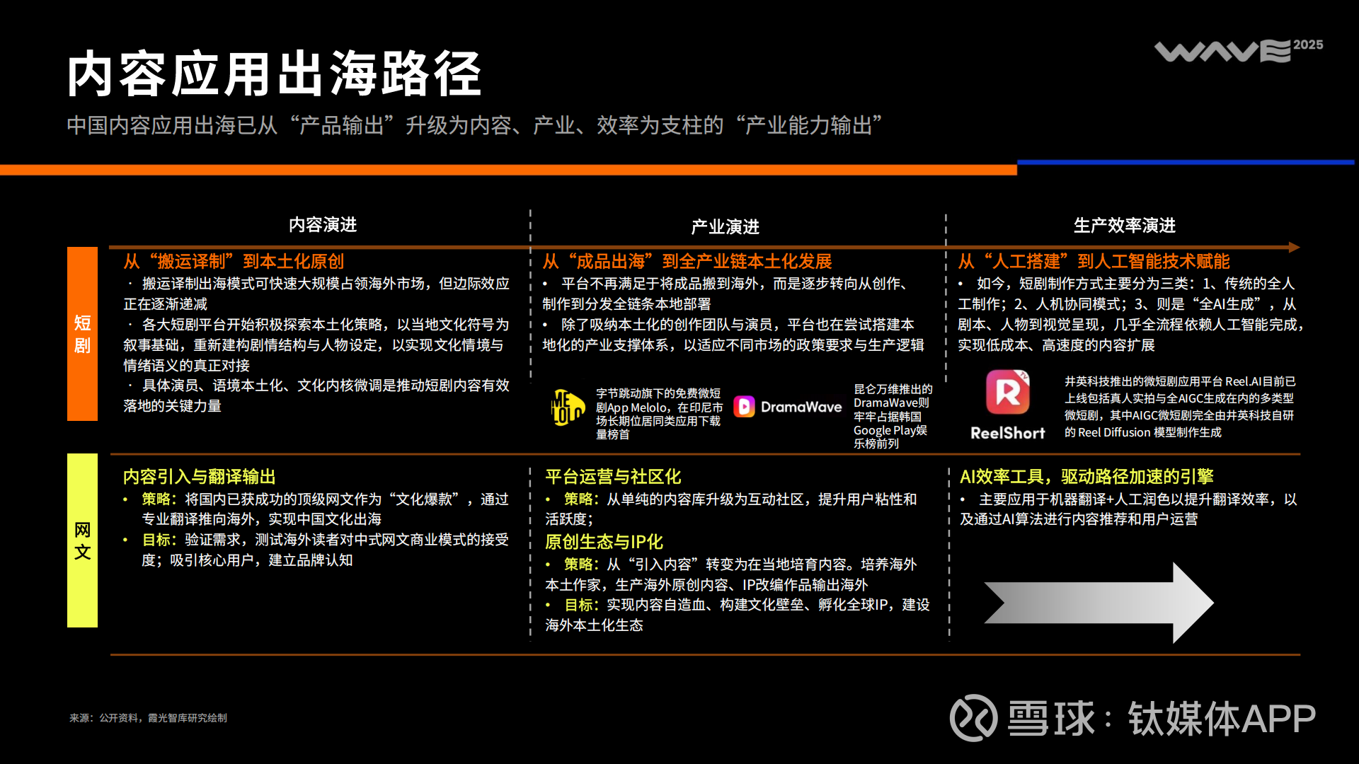 接着从出海路径上来看,短剧和网文出海,都经历了从内容演进,到产业演进再到如今的AI加持、提升效率三个阶段。