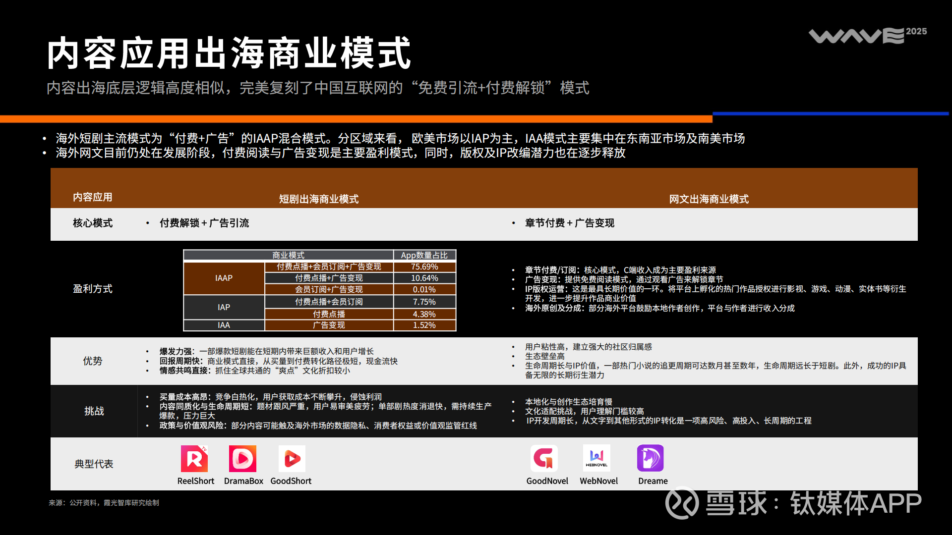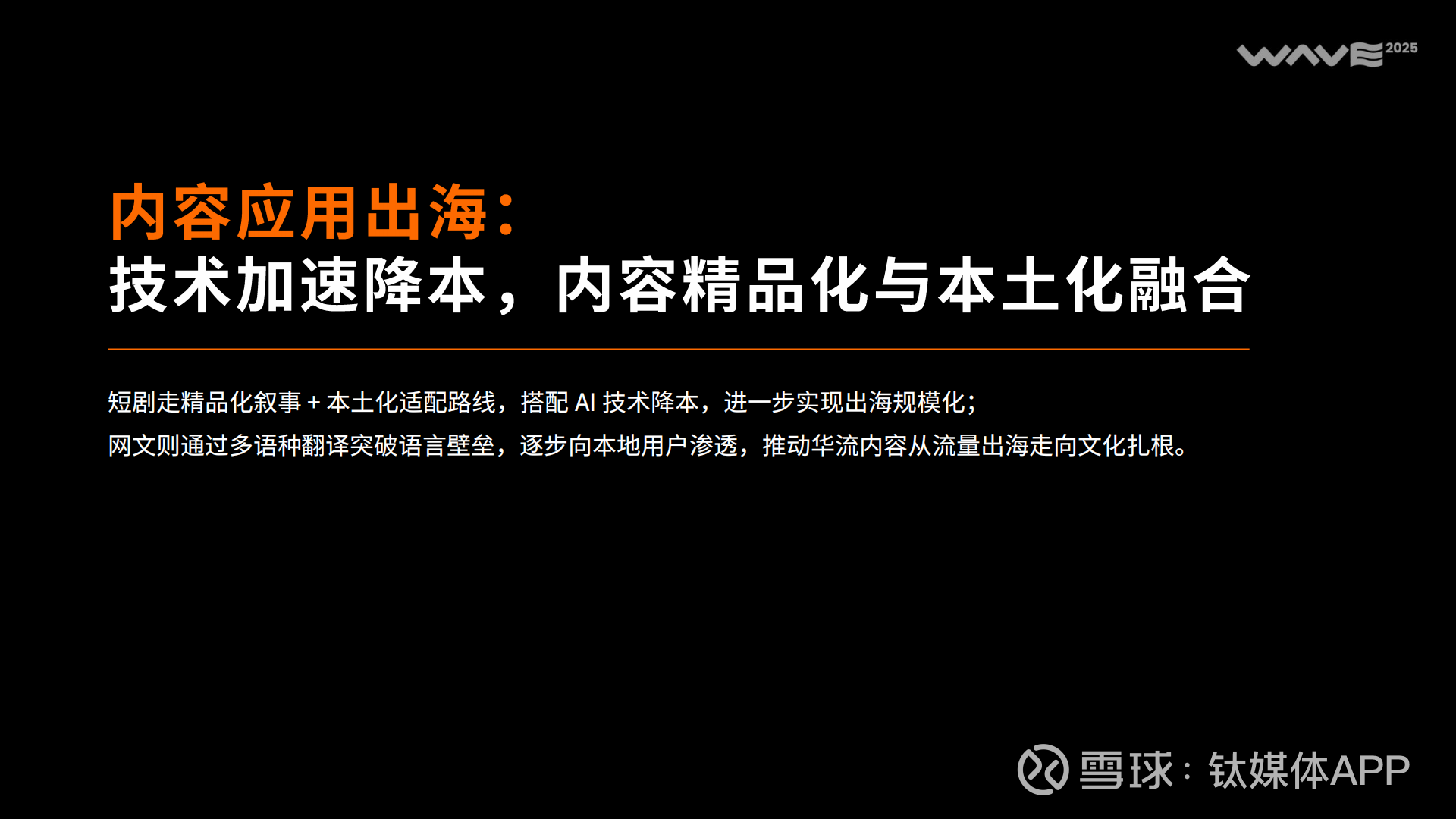 短剧走精品化叙事 + 本土化适配路线,搭配 AI 技术降本,进一步实现出海规模化;网文则通过多语种翻译突破语言壁垒,逐步向本地用户渗透,推动华流内容从流量出海走向文化扎根。