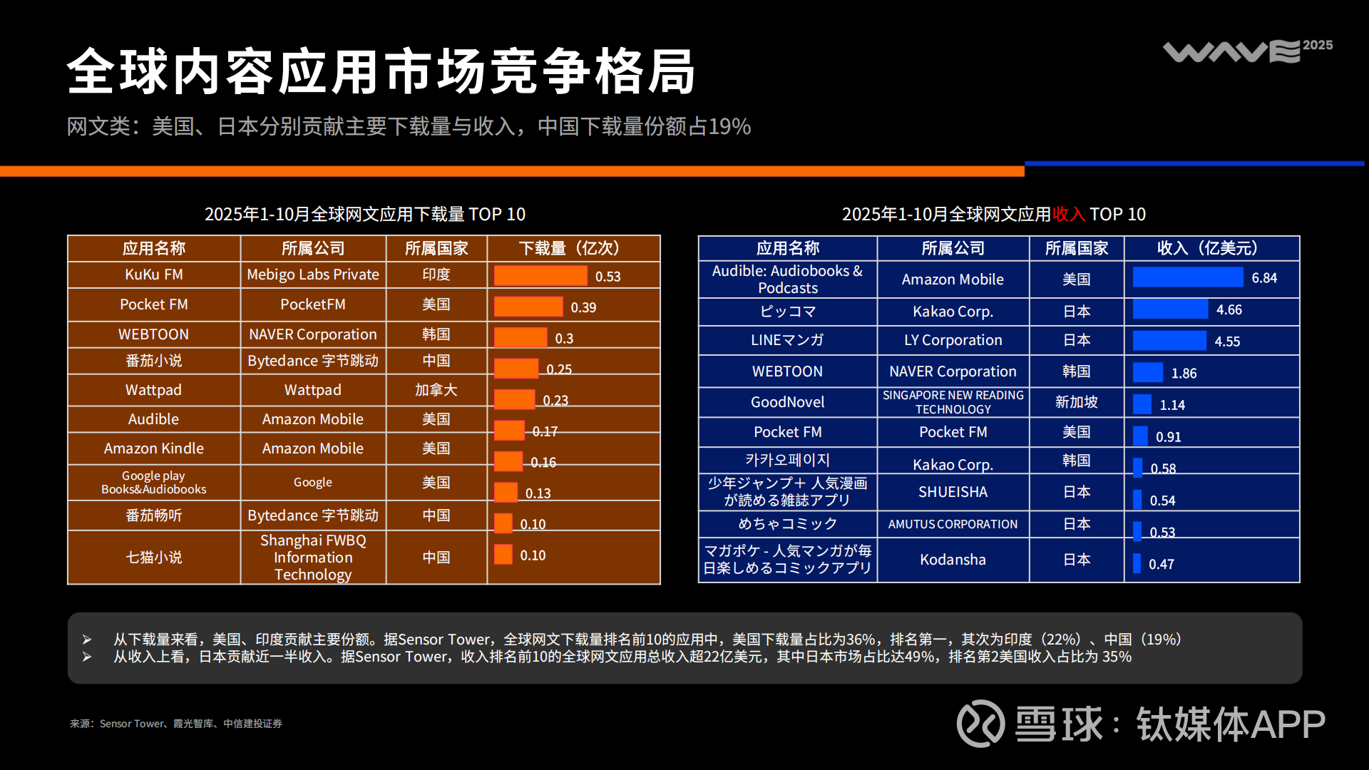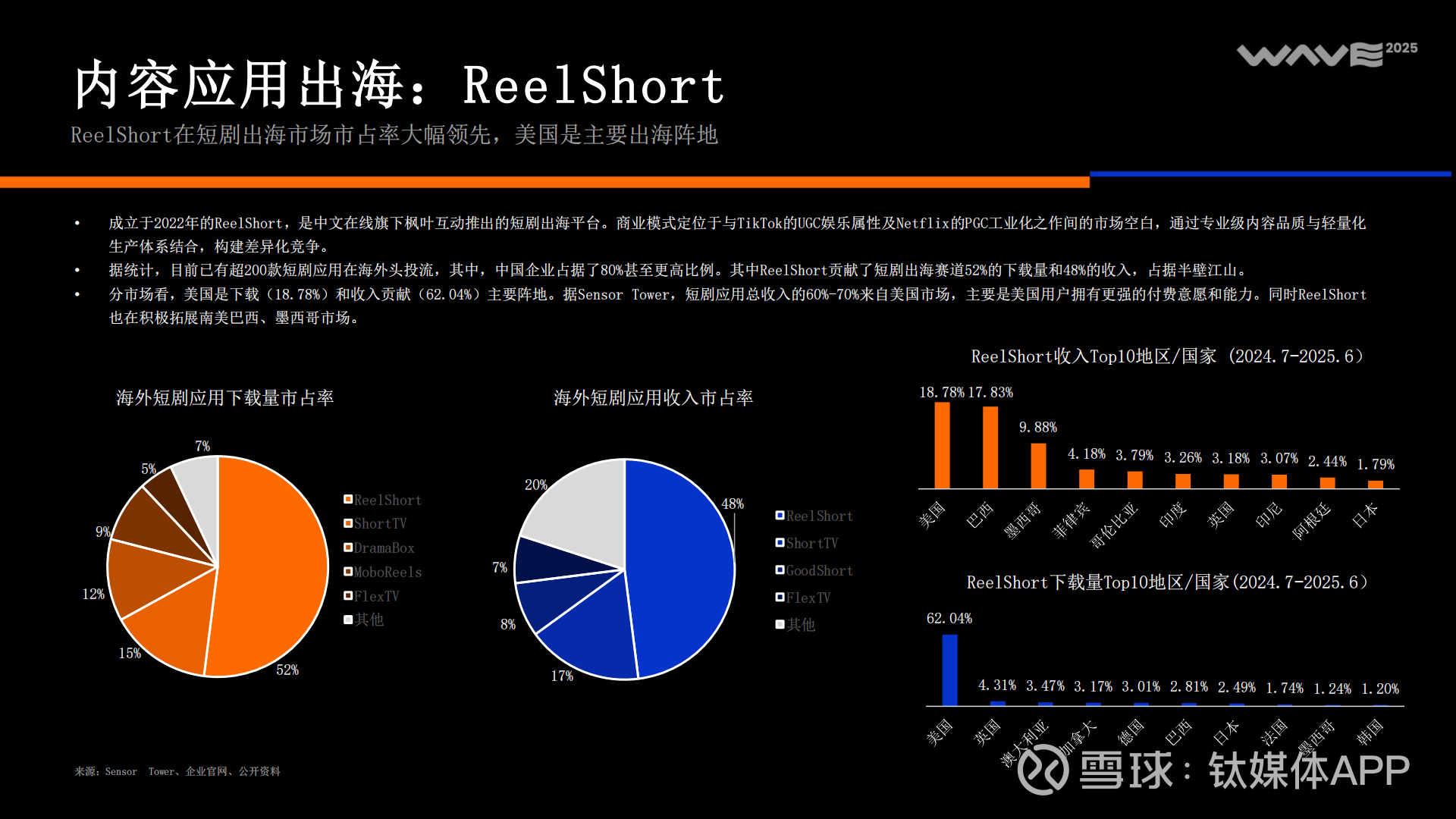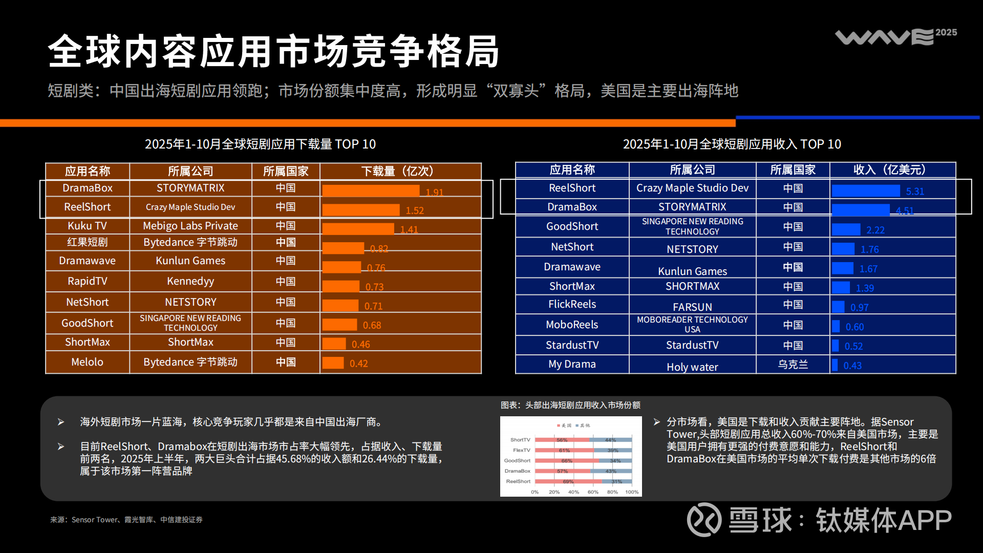 然后从竞争格局来看,今年前10个月全球短剧应用下载量 TOP 10的短剧应用,全部来自于中国。从收入上看,两家中国出海的短剧平台ReelShort与DramaBox共占全球短剧市场近半数收入(45.68%),且头部短剧应用总收入60%-70%来自美国市场,因为美国用户拥有更强的付费意愿和能力。