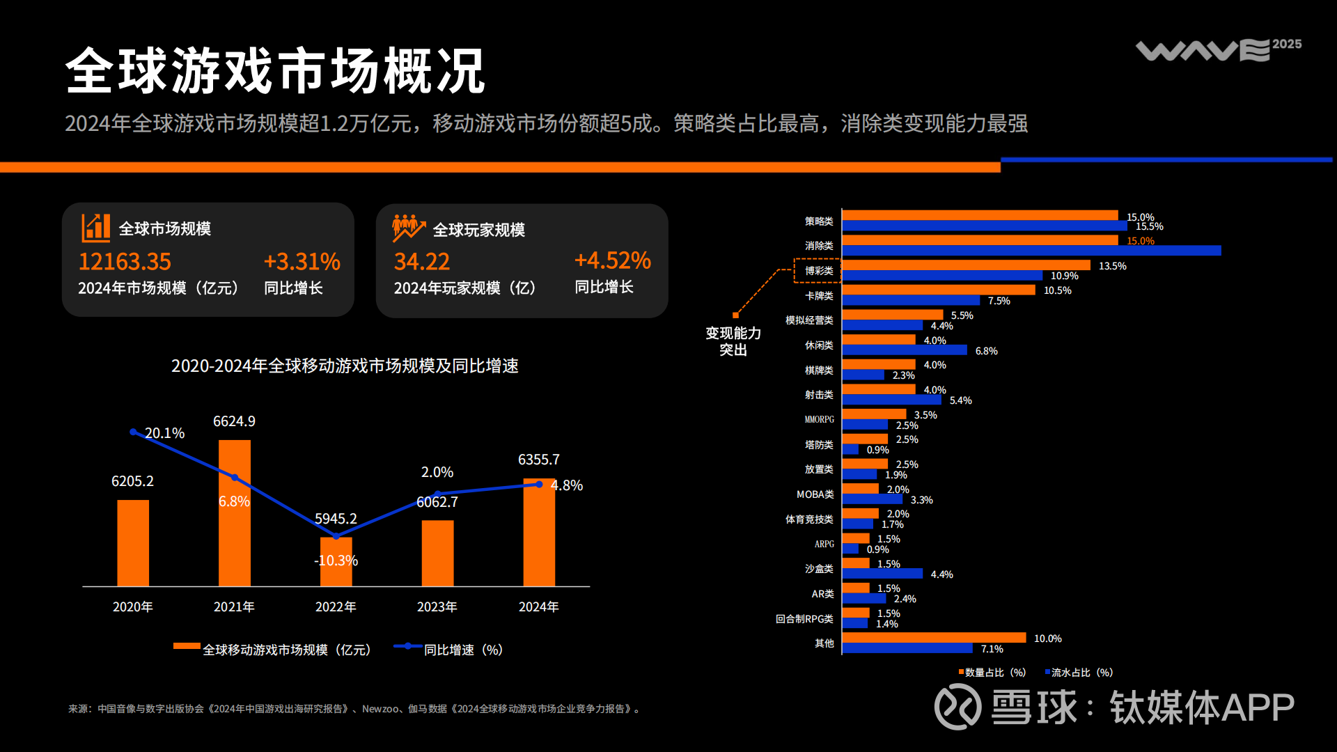 2024年,全球游戏的市场规模超过了1.2万亿,移动游戏市场份额已经超过了一半。右侧这一栏是流水TOP200移动游戏类型,可以看到消除类游戏的变现能力最强,占总流水的20.6%。