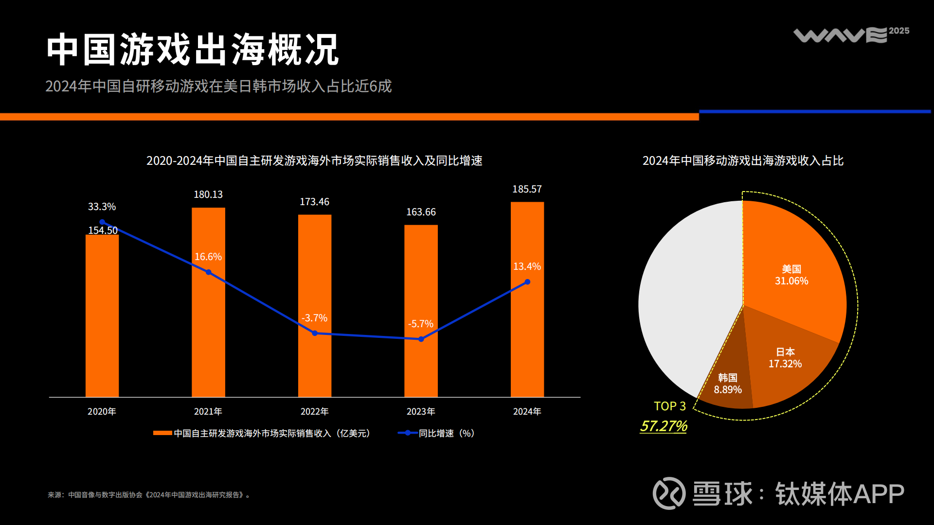 从中国自研游戏海外市场收入上来看,与2022、2023年相比,2024年是增速明显、再创新高的一年,达到了185.57亿元,同比实现了13.4%的增长。其中,收入占比前三的地区为美国、日本、韩国,且这三个地区的收入达到总收入的近六成。