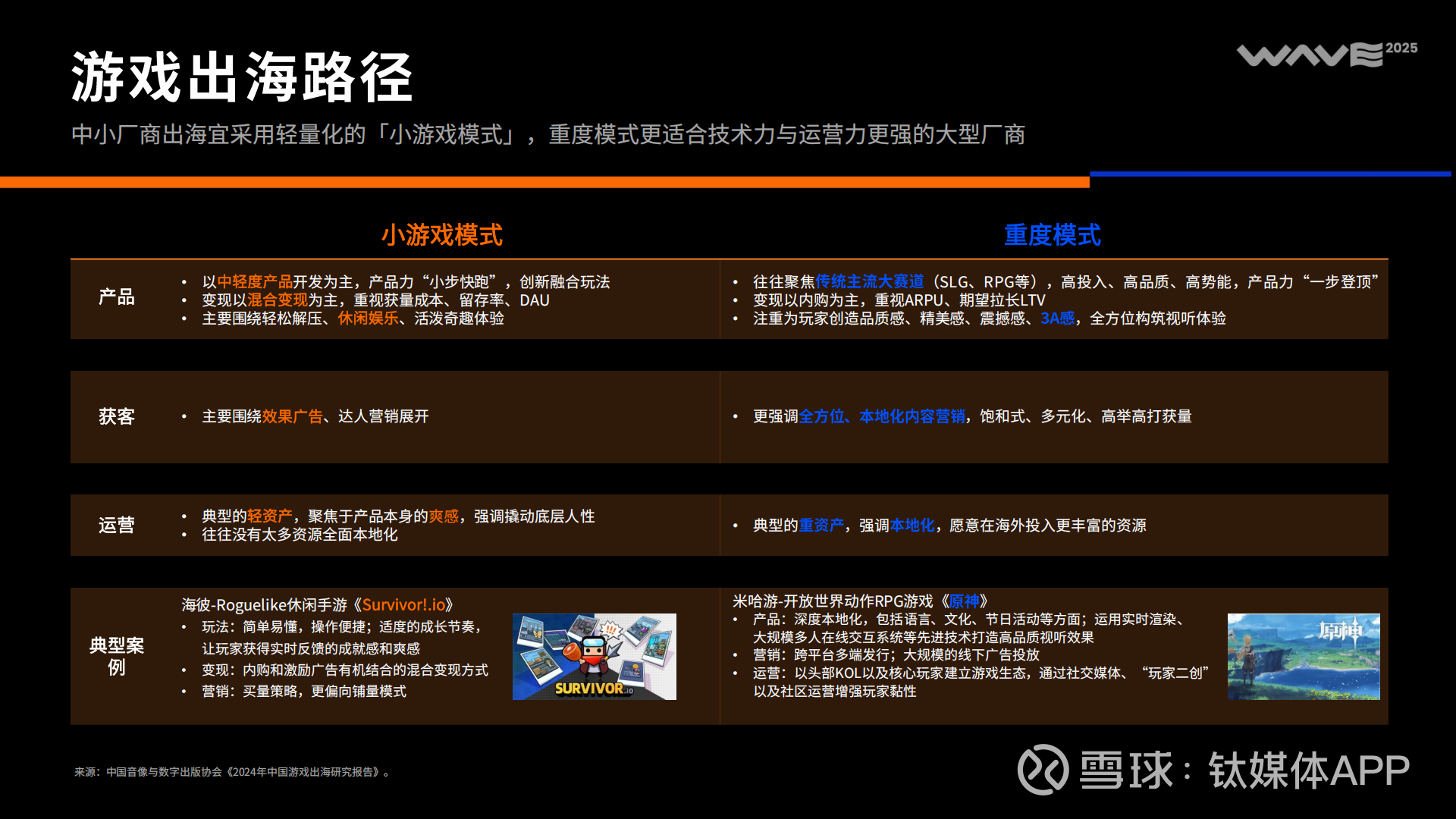从路径来看,中小厂商出海更适合采用轻量化的小游戏模式;而技术力与运营力更强的大型厂商更适合重度模式。