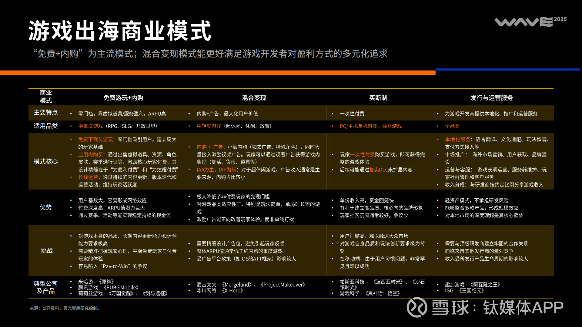 再来看看商业模式。目前游戏出海主要有四种商业模式。免费+内购,是目前的主流变现模式,代表项目就是腾讯游戏的《和平精英》。其他商业模式还有混合变现、买断制,以及负责发行与运营服务变现。目前看,混合变现的模式,更能满足游戏开发者对盈利方式多元化的追求。