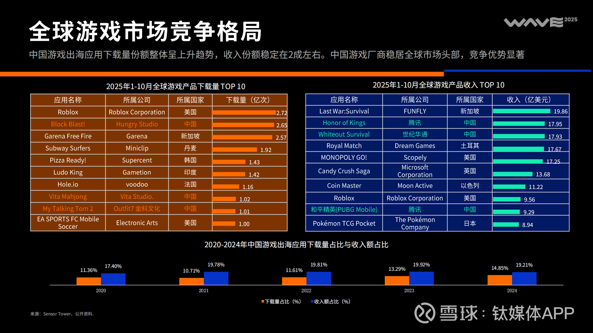 我们再来看看今年以来,全球游戏市场的竞争格局。整体来看,中国游戏出海应用下载量份额呈上升趋势,收入份额稳定在两成左右。前10个月的全球游戏产品下载量TOP 10中,有近三分之一属于中国厂商。可以说,无论是下载量维度还是收入规模,中国游戏都稳居全球市场的头部位置了。
