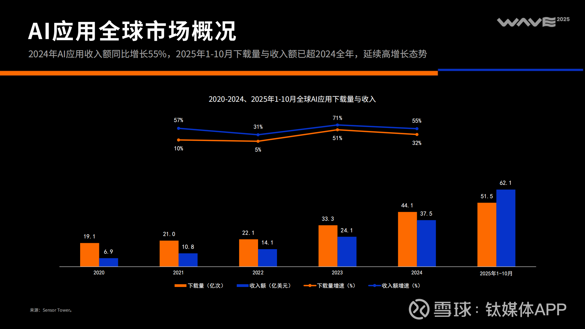 如今,AI应用是最为炙手可热的上升赛道,从年初爆火的DeepSeek,到Manus,都引发全网乃至全球的关注。2024年这一细分领域收入额同比增长55%,而在今年十个月,它的下载量与收入额已经超过了2024年全年。