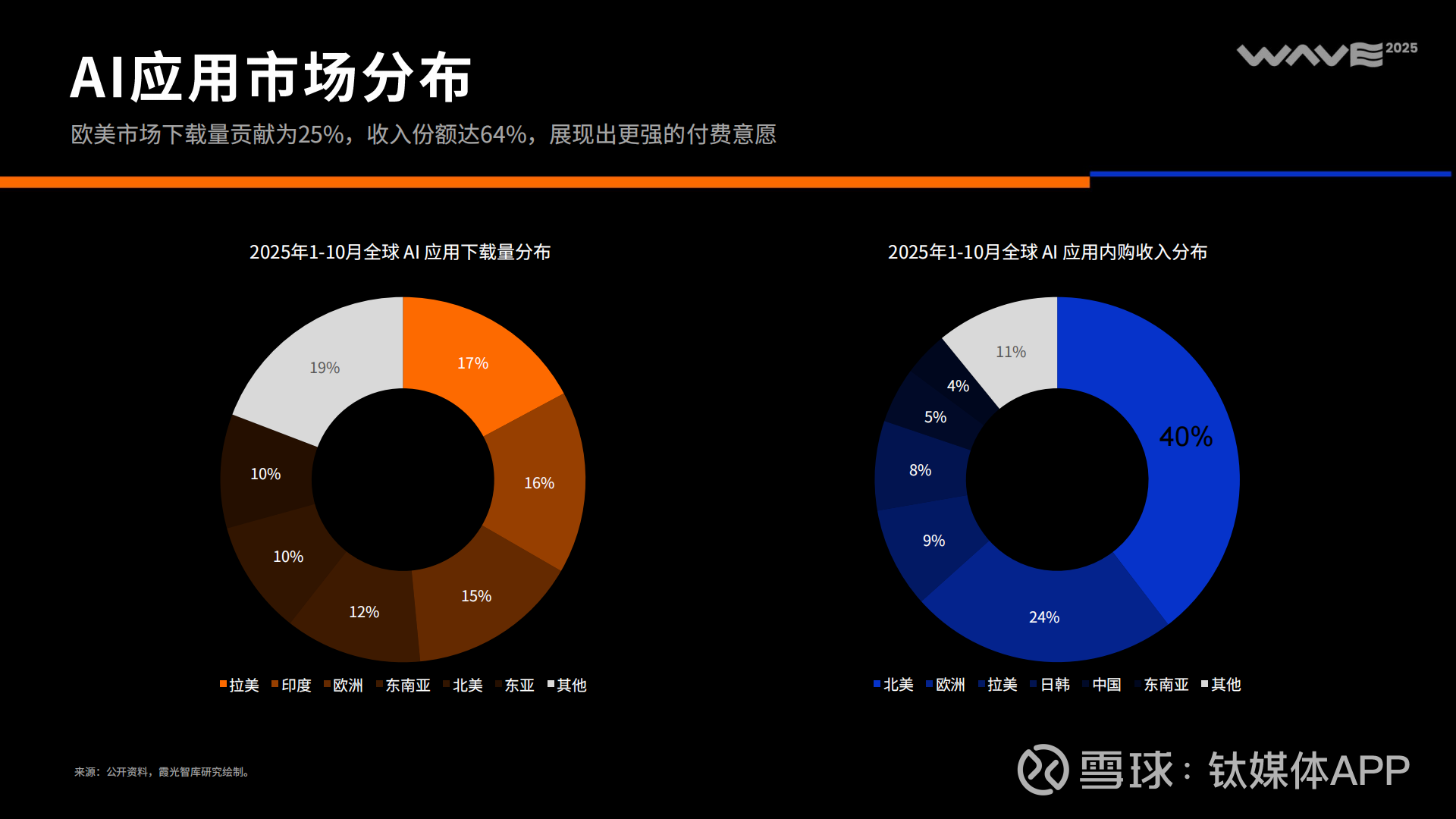 从市场分布来看,印度、拉美等新兴市场贡献了下载量,而欧美市场则贡献了收入。比如Manus,在国内火爆后,它便迁移到了海外,目前的市场以美国、欧洲、日本等为主。