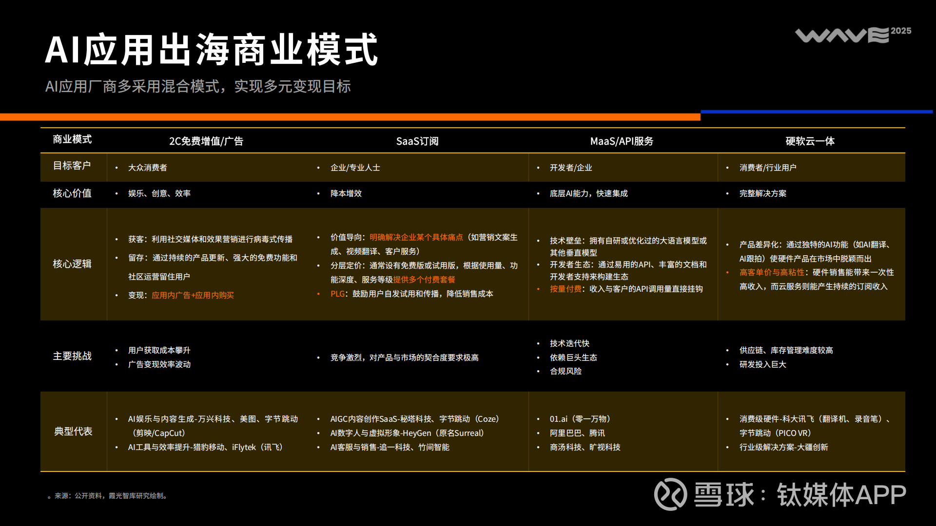 从商业模式上来看,在实际工作中,因目标客户而异,AI应用出海多采用混合盈利模式。