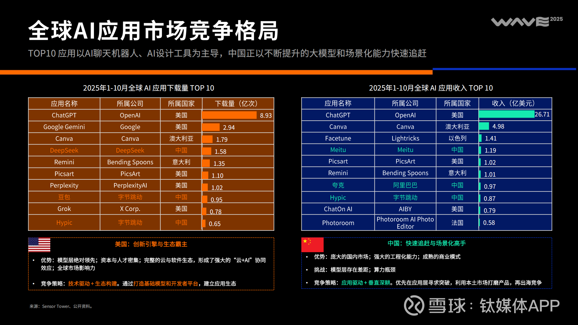 从竞争格局来看,今年前十个月里,全球TOP 10应用以AI聊天机器人、AI设计工具为主导。美国依然是创新引擎和生态霸主,模型层技术领先、资本与人才密集;中国的优势是有庞大的市场、强大的工程化能力和多样化的商业模式,我们正以快速迭代的大模型能力和场景化能力追赶美国。