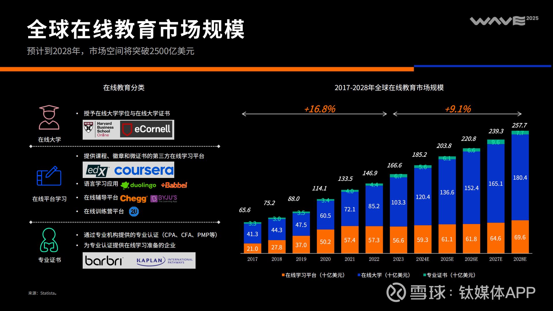 我们把在线教育业务划分为在线大学、在线平台学习和专业证书三大类。预计到2028年,它的整体市场空间仍会保持9%以上的增长速度,达到2500亿美元。
