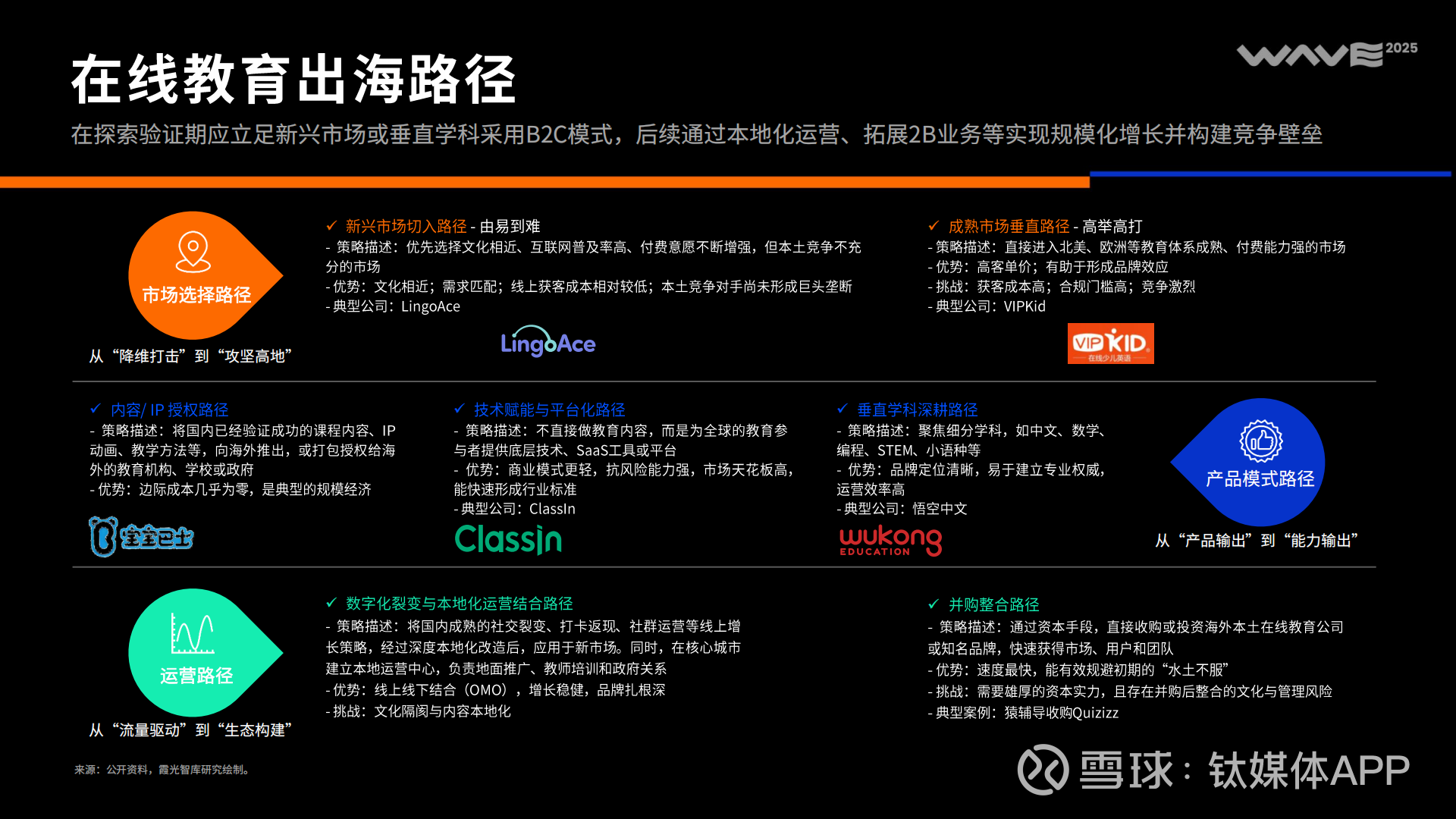通过分析过去在线教育企业的出海路径,我们发现,从市场选择上看,在线教育出海企业多以新兴市场为切口走“降维打击”路线,以及在成熟市场走攻坚路线;从产品和运营角度看,在线教育的出海路径可以总结为以优势产品垂直切入,靠深度本地化扎根生长。比如今天来到我们大会的伴鱼PalFish,它以少儿英语起家,2023年开始战略性布局海外线下门店,目前已经在海外开了14家学习中心,至今海外业务年均增长率超过150%,成为企业的第二增长曲线。