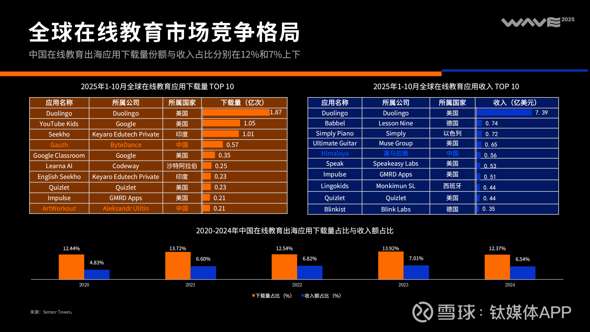 这一页展示了今年前10个月全球前十的在线教育应用,从下载量看美国、印度依然是第一梯队,中国有两款入围;从收入前十来看,美国依然是遥遥领先,中国只有一款应用进入前十。