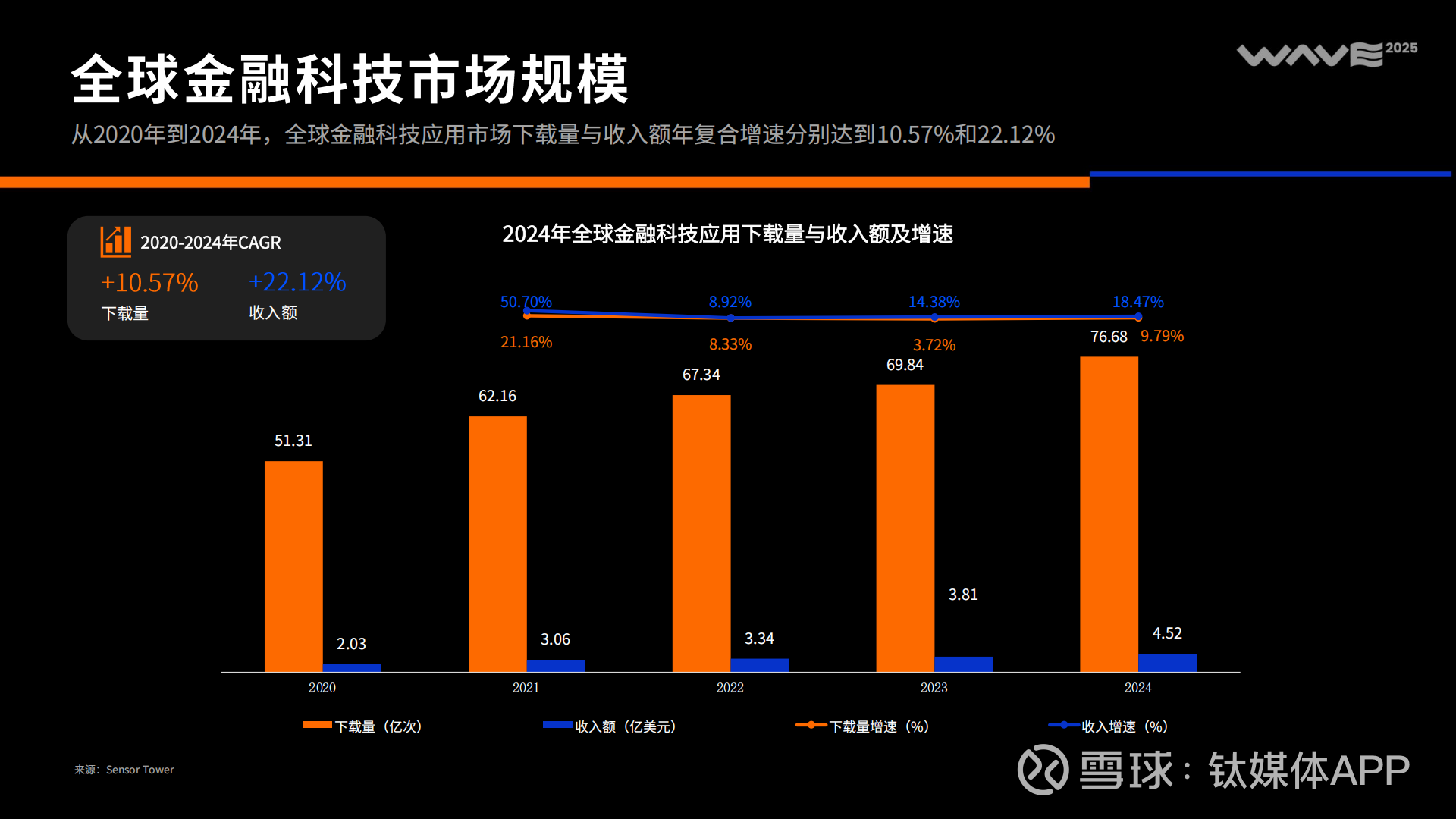 过去五年里,全球金融科技应用下载量与收入额年复合增速分别达到10.7%和22.12%,是一个比较稳健增长的赛道。