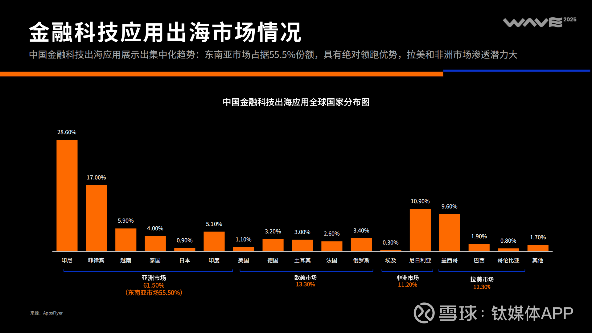 中国的金融科技出海,呈现出集中化的趋势,主要在东南亚,因为这里不仅人口多,对金融基础设施需求也比较迫切。它贡献了超过55%的用户量,而印尼一个国家就占了东南亚用户量的一半多。相比之下,欧美发达国家市场用户占比较低。反而拉美市场则表现出一定的潜力。这说明新兴市场对金融科技的需求和接受度更旺盛。