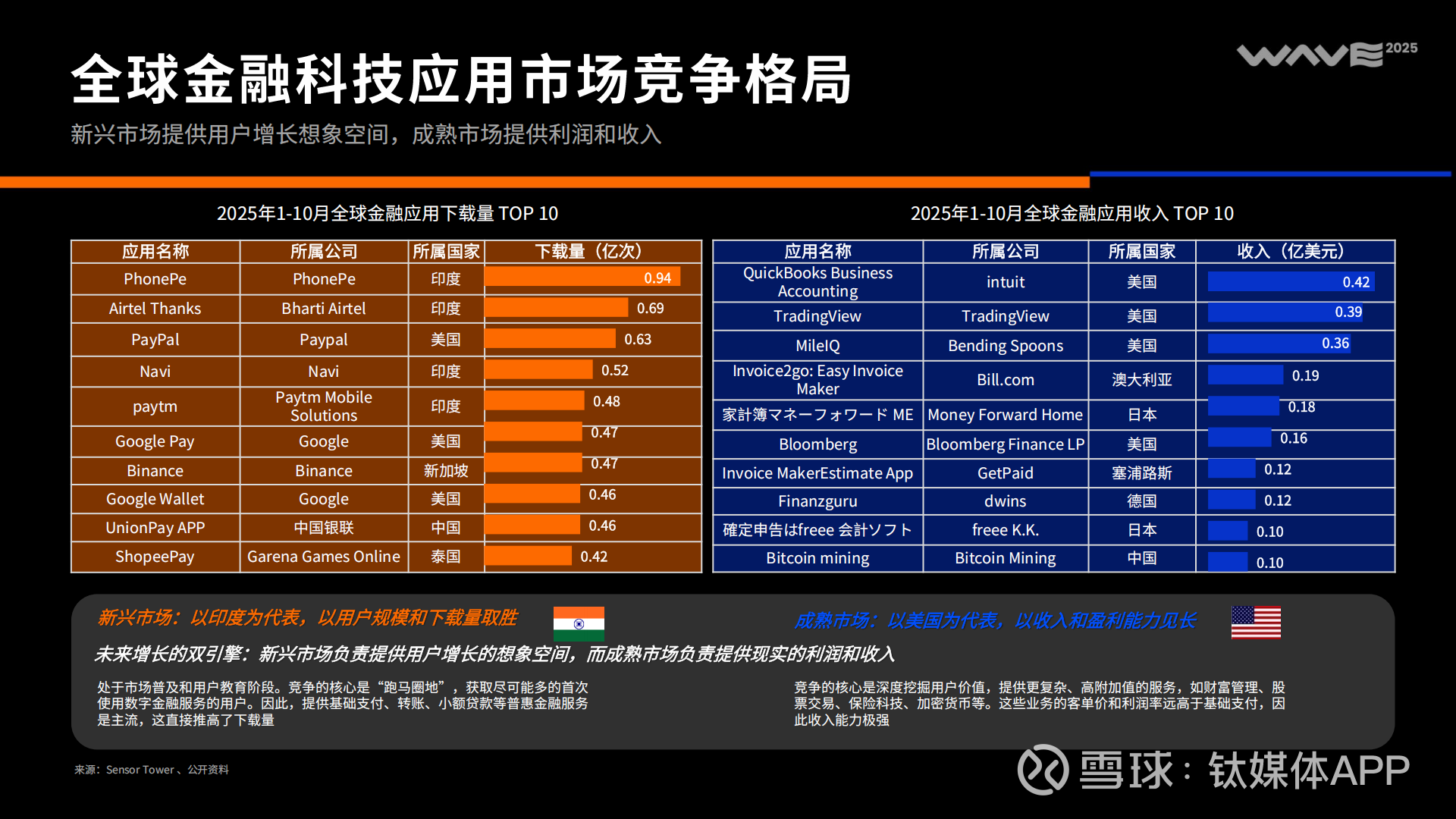 从全球金融科技的竞争格局来看,下载量前十的金融科技应用中,主要来自印度和美国,中国只有中国银联入围;从应用收入Top10来看,来自美国、英国的应用占据了收入的大头。