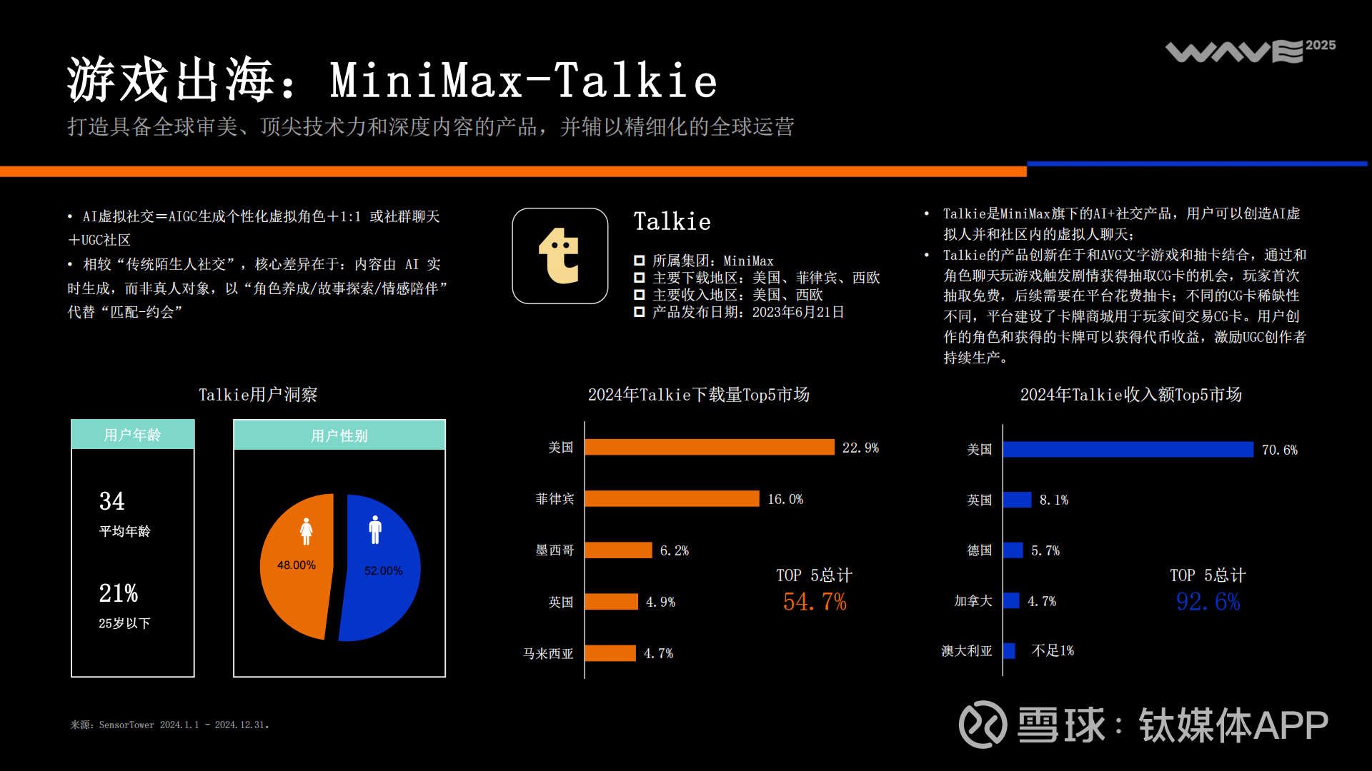 首先我们以Talkie为例,先来看看社交出海的典型画像。Talkie是MiniMax在2023年发布的AI+社交产品。与“传统陌生人社交”相比,用户可以用它创造AI虚拟人,并和社区内的虚拟人聊天,它的用户也是以欧美年轻女性为主,美国占它全球收入额的68%。