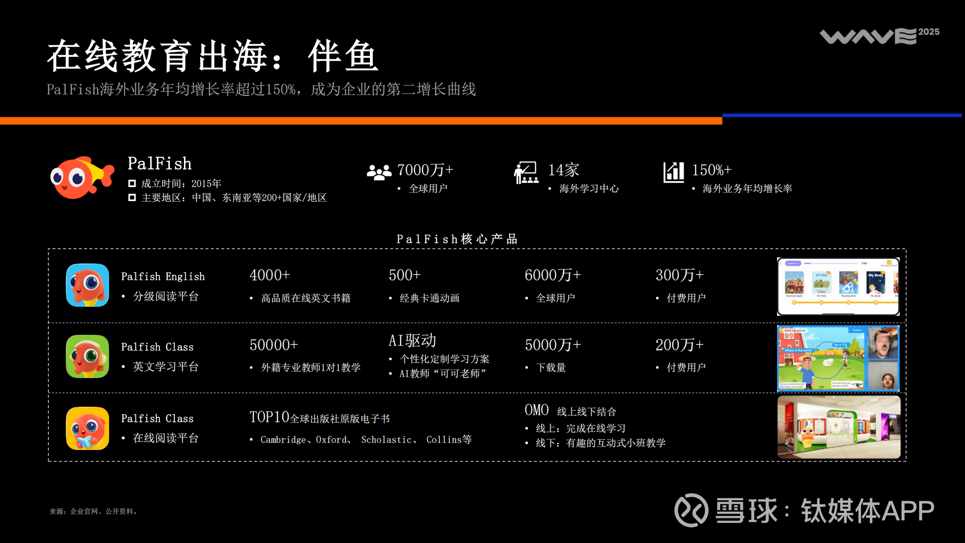 下一个关注度较高的是在线教育出海,我们以伴鱼PalFish为例,它以少儿英语起家,2023年开始战略性布局线下门店,目前已经在海外开了14家学习中心,与此同时也在把AI融入教学中,至今海外业务年均增长率超过150%,成为企业的第二增长曲线。