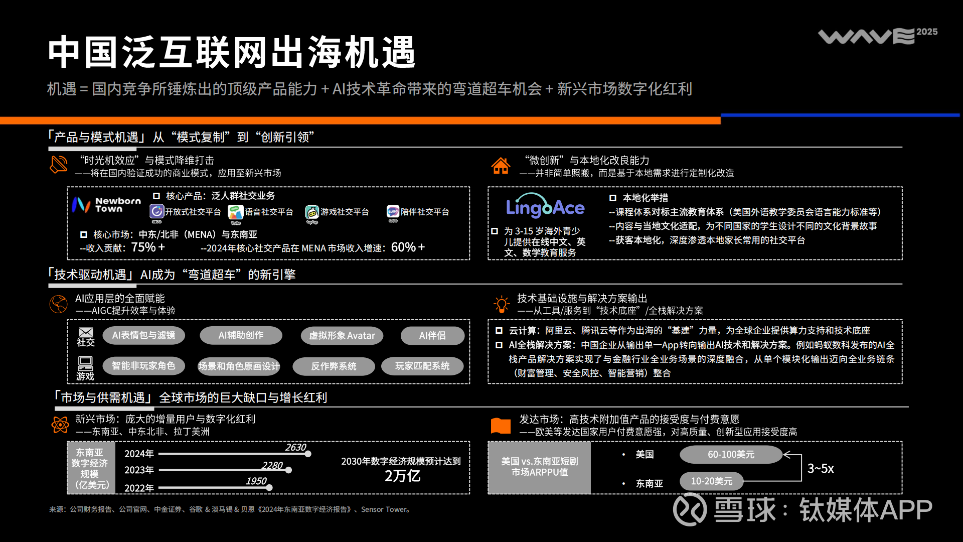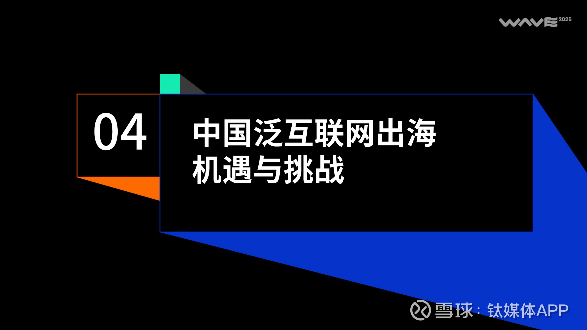 先来整体看一下机遇和挑战。机遇上,我们看到,基于国内竞争所锤炼出的顶级产品能力,和AI技术革命带来的弯道超车机会,以及新兴市场的数字化红利,中国泛互联网出海正迎来新的发展机遇,未来几年正是中国泛互产品在全球崛起的最佳时机。