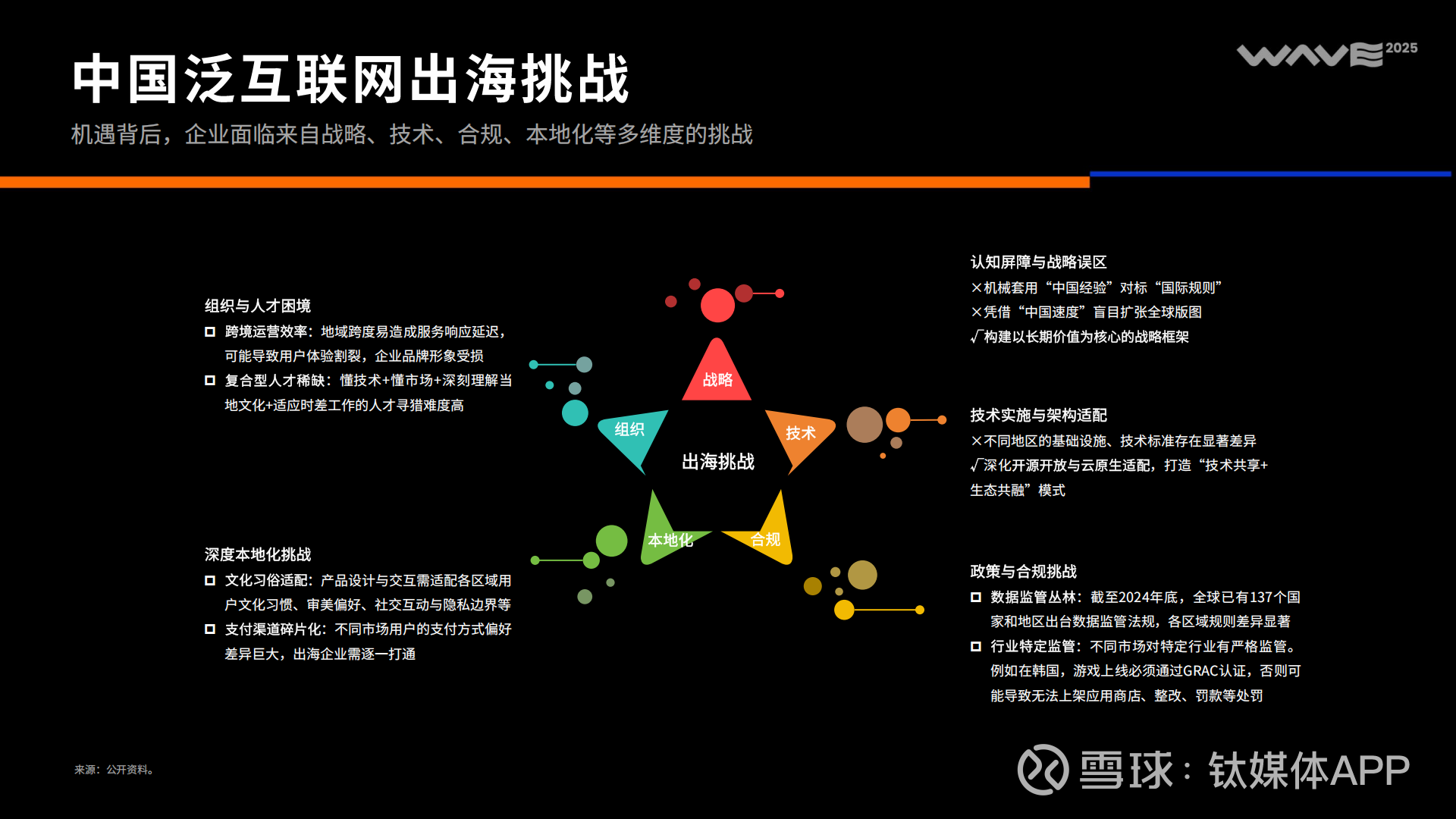 但同时也有挑战。出海企业会面临来自战略、技术、合规、本地化等多维度的挑战。从认知屏障与战略误区、到文化习俗适配,再到监管趋严、数据合规,每一项挑战都能决定企业或产品的生死,这也倒逼企业需要更清晰地理解行业趋势走向,捕捉技术风口,洞察海外市场变化。
