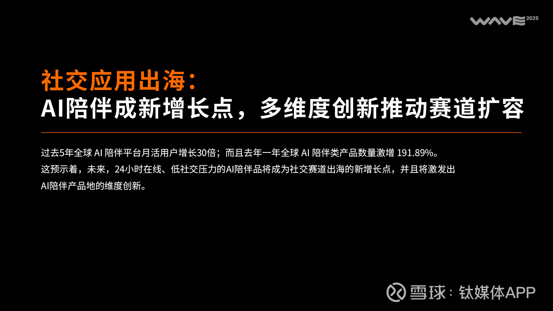 社交应用出海:AI陪伴成新增长点,多维度创新推动赛道扩容过去5年全球 AI 陪伴平台月活用户增长30倍;而且去年一年全球 AI 陪伴类产品数量激增 191.89%。这预示着,未来,24小时在线、低社交压力的AI陪伴品将成为社交赛道出海的新增长点,并且将激发出AI陪伴产品地的维度创新。