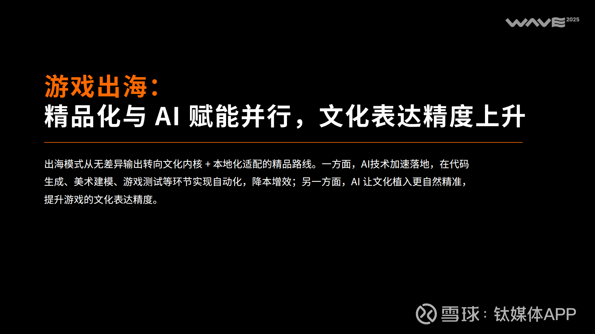 出海模式从无差异输出转向文化内核 + 本地化适配的精品路线。一方面,AI技术加速落地,在代码生成、美术建模、游戏测试等环节实现自动化,降本增效;另一方面,AI 让文化植入更自然精准,提升游戏的文化表达精度。