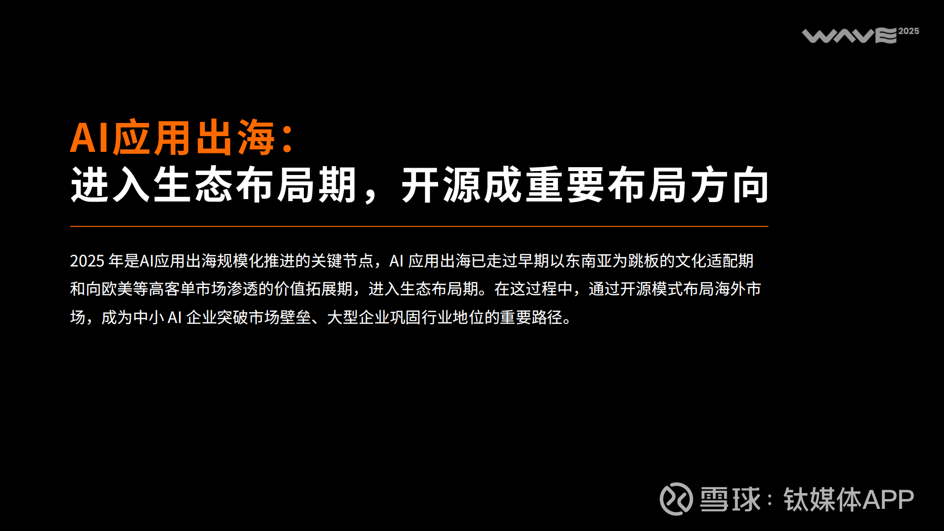 2025 年是AI应用出海规模化推进的关键节点,AI 应用出海已走过早期以东南亚为跳板的文化适配期和向欧美等高客单市场渗透的价值拓展期,进入生态布局期。在这过程中,通过开源模式布局海外市场,成为中小 AI 企业突破市场壁垒、大型企业巩固行业地位的重要路径。