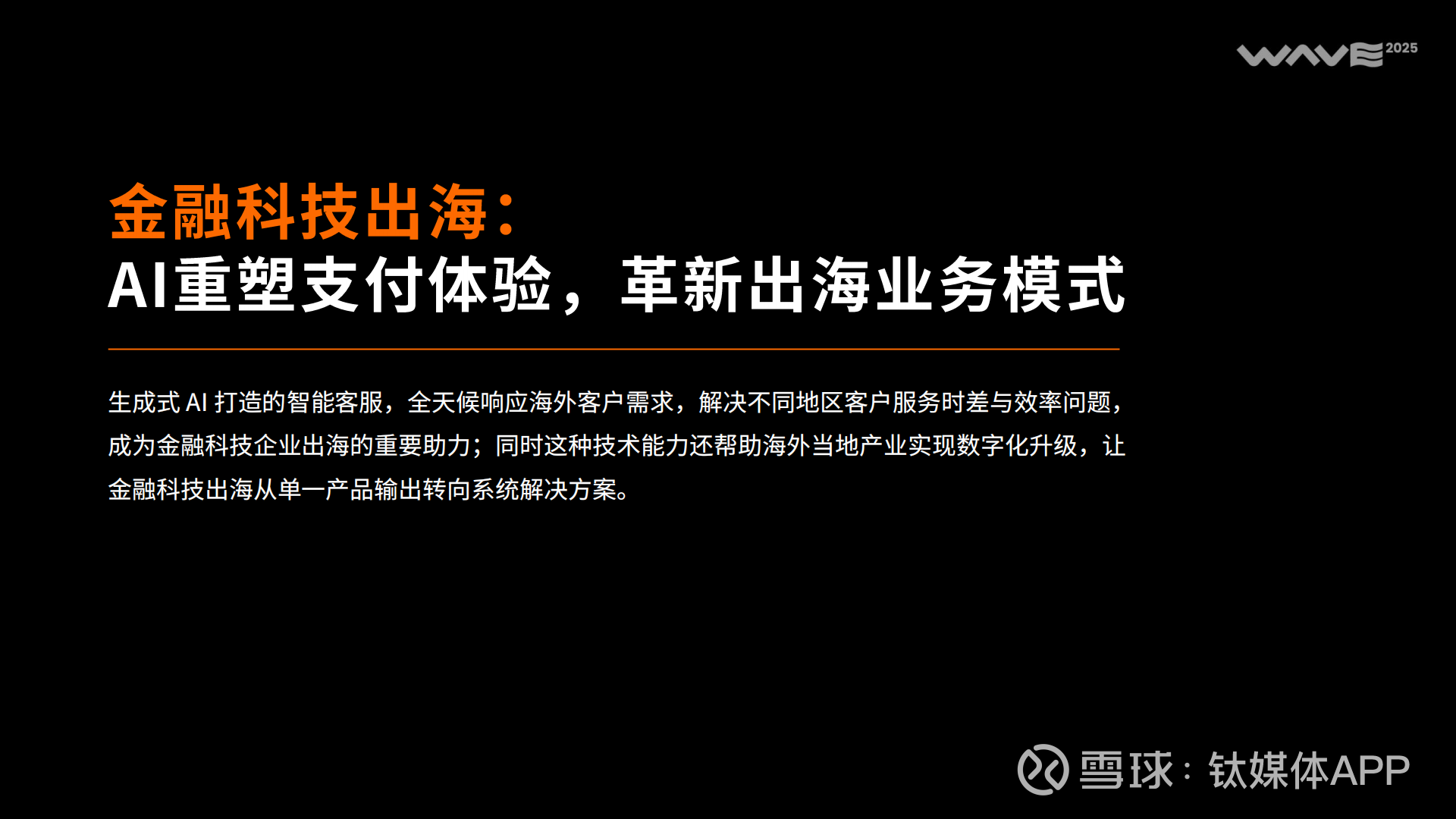 生成式 AI 打造的智能客服,全天候响应海外客户需求,解决不同地区客户服务时差与效率问题,成为金融科技企业出海的重要助力;同时这种技术能力还帮助海外当地产业实现数字化升级,让金融科技出海从单一产品输出转向系统解决方案。
