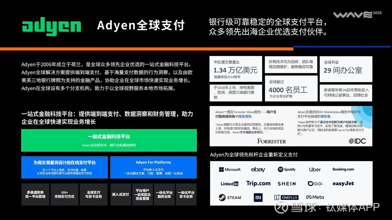 贯穿业务增长过程中,有一个环节必不可少,那就是支付。最近几年,随着出海企业海外市场多元,加之全球经济波动,使大家对资金流动的安全性和市场广泛性都很关注。Adyen就是一家银行级可靠稳定的全球支付平台,为企业提供端到端支付、数据洞察和财务管理等服务。它拥有超过4000名员工,在全球设有29个办公室,每年处理交易量达1.34万亿美元。
