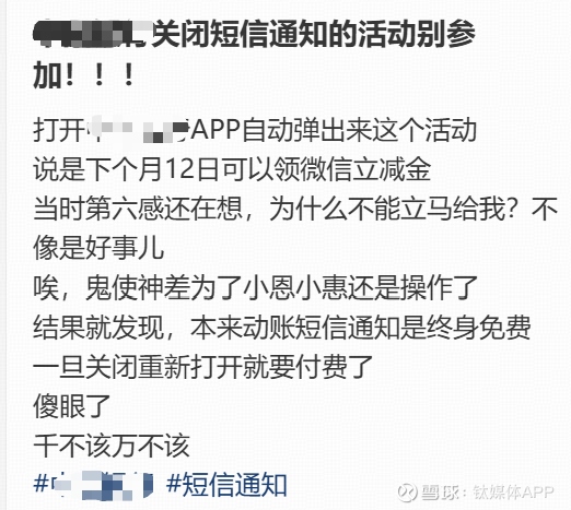 近期,有小红书用户反馈,自己打开银行app时弹出了一个“动账通知升级”的活动邀请,只需要关闭短信动账通知,打开手机银行动账提醒,在次月就可以领取5元-15元的立减金。她按照银行的要求参加活动后,才发现上当了——本来终身免费的动账短信,现在再想重新开通,每个月要收费3元。