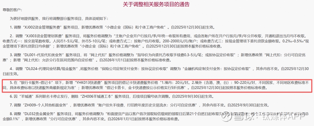 9月28日,招商银行发布了一则“关于调整相关服务项目的通告”,宣布对个人借记卡用户新增“快递费”收费项目,标准是境内收费 20 元 / 封,境外(含港澳台)90 - 220 元 / 封。虽然对普卡、金卡打五折,但过去招商银行通常免费邮寄新办或补换的借记卡(尤其是金卡及以上客户),普通卡也可能免邮。