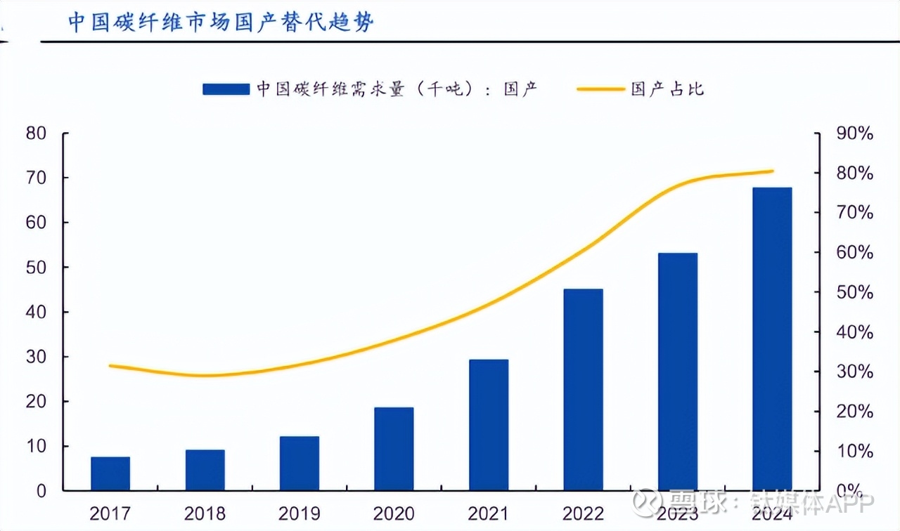 2019年至2023年,中国碳纤维产业迎来产能“大爆发”,五年间产能增长近五倍,国产化率也随之飙升,2022年国产碳纤维用量历史上首次超越进口量,2024年国内碳纤维市场的国产替代率突破80%。