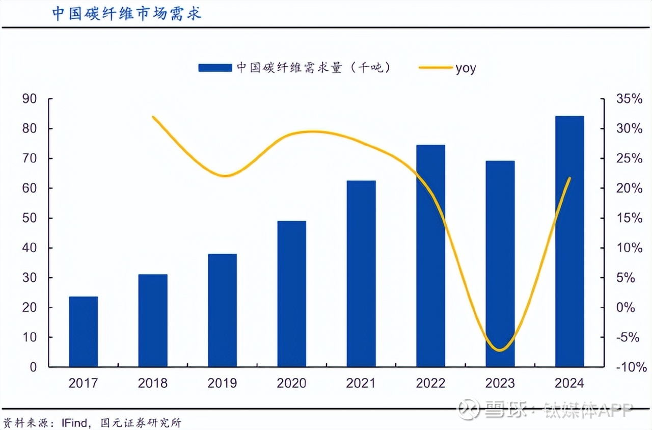 中研普华产业研究院相关报告称,国内碳纤维产能从2021年的6.34万吨扩张至2025年的14.4万吨,年复合增长率达22.8%;中商产业研究院则预计2025年中国碳纤维产能将超过15万吨。