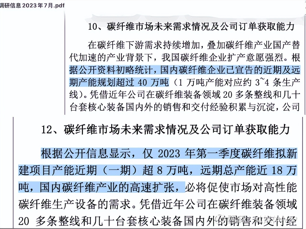 2023年年中,其发布的投资者关系活动记录称: “据公开资料初略统计,国内碳纤维企业已宣告的近期及远期产能规划超过40万吨…..仅2023年第一季度碳纤维拟新建项目产能近期(一期)超8万吨,远期总产能近18万吨。”