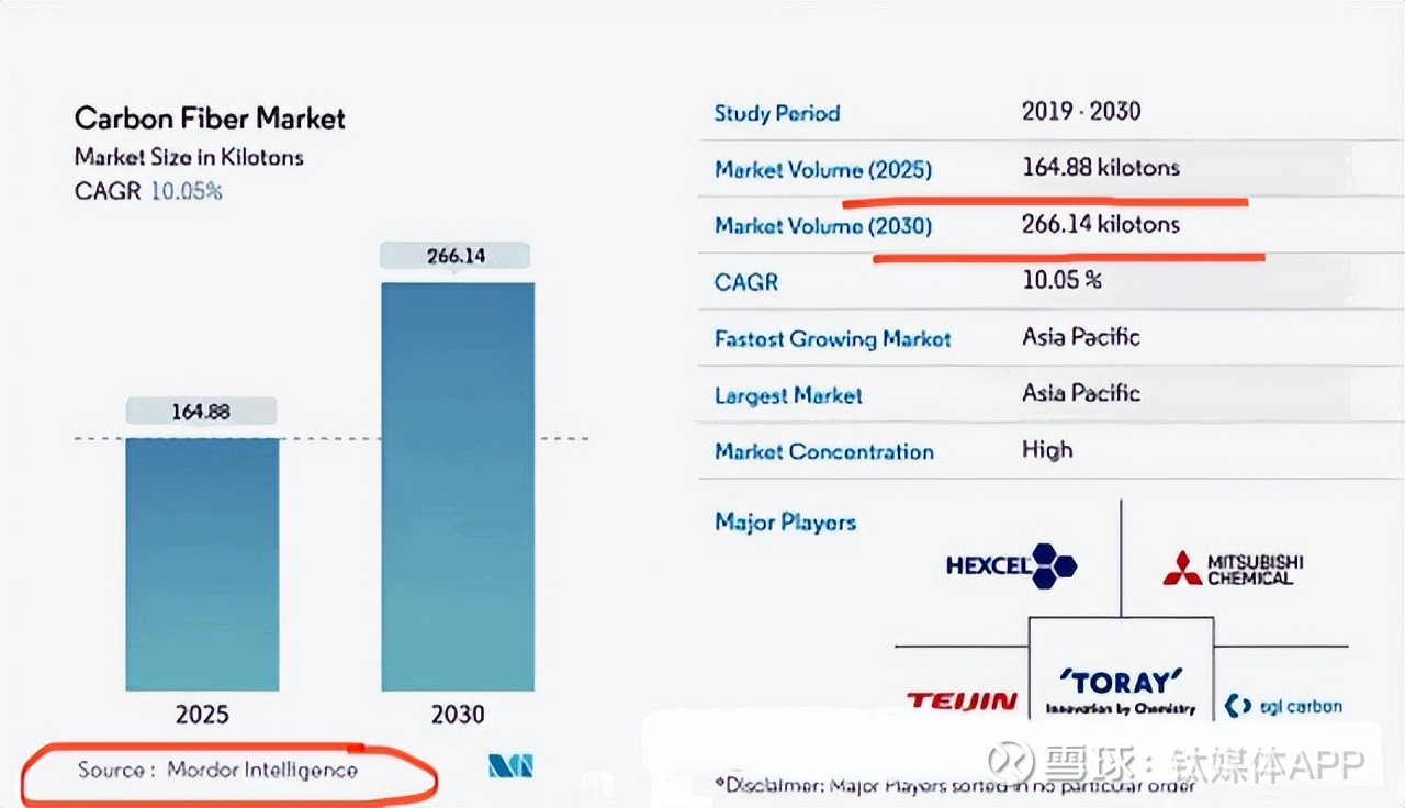 全球市场研究与战略咨询知名机构“Mordor Intelligence”年初发布报告显示:“ 2025年全球碳纤维市场规模预计16.49万吨,2030年预计可以达到26.61万吨。”更乐观的机构预测,2025年全球碳纤维需求可至20万吨,2030年35万吨。