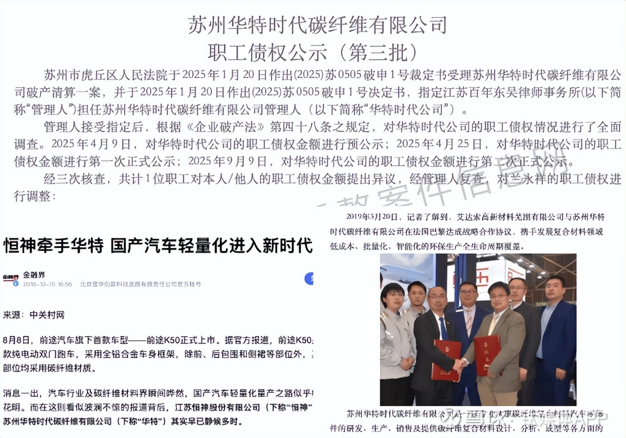 苏州华特时代碳纤维有限公司,前身为长城华冠前途汽车成型车间,2014年启动碳纤维覆盖件应用研究,2018年6月独立注册成立。彼时注册资金高达6.6亿,曾与恒神等企业合作。在使用碳纤维替代来实现汽车轻量化的道路上挣扎约7年之后,2025年前后宣告破产。