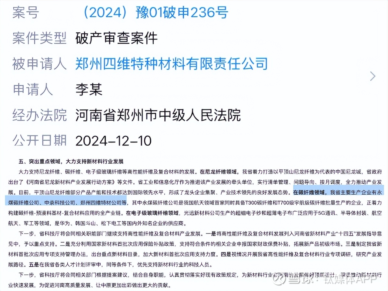 郑州四维特种材料有限公司,河南科技厅于2021年10月回复相关建议时被列为省内碳纤维领域“主要生产企业”,2024年末被法院裁定破产。