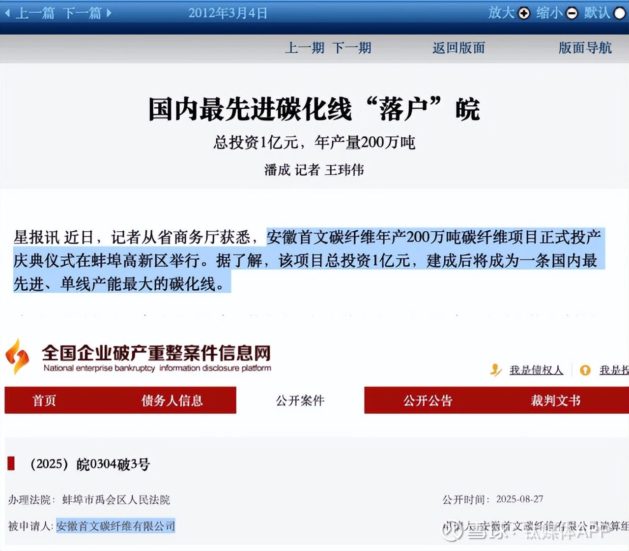 安徽首文碳纤维有限公司,早在2012年就投产200万吨碳纤维项目,被誉为“国内最先进碳化线”,同样在2025年未能捱过去。