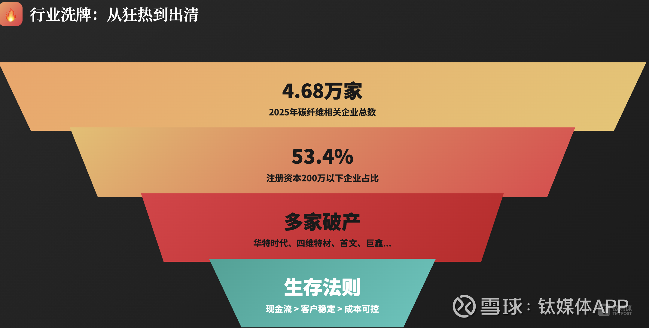 如此庞大队伍当中,注册资本200万以下的碳纤维相关企业数量占比竟高达53.4%。当内卷的寒风吹过,自然有人在行业洗牌中倒下。