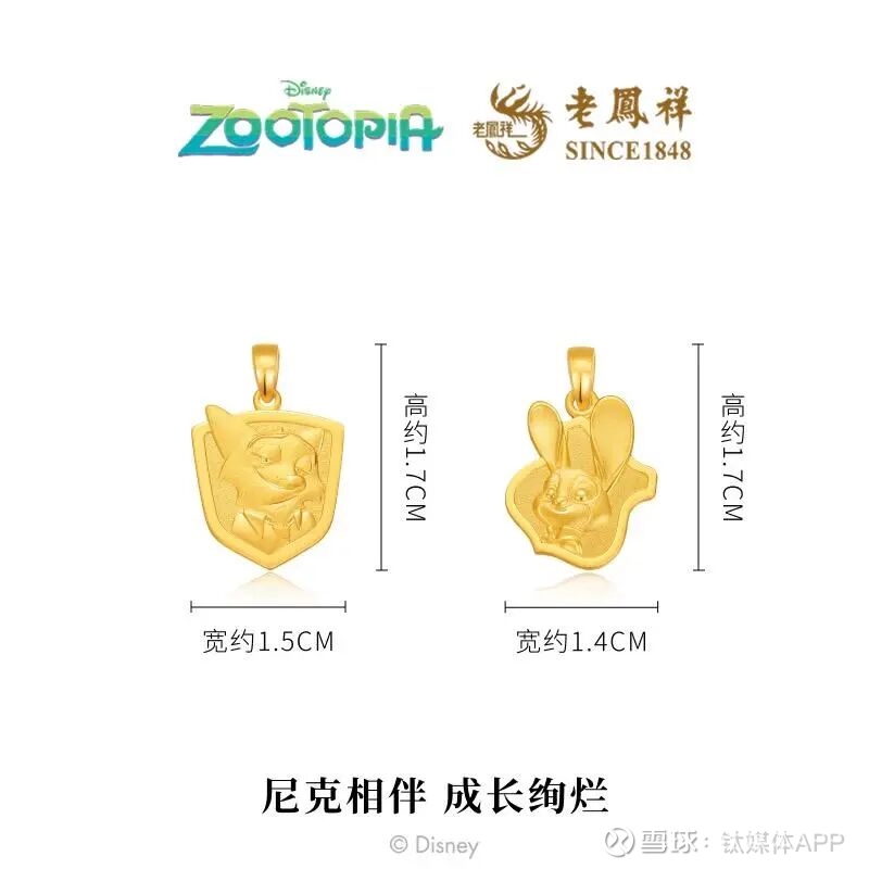 除了几十元的联名徽章、录音笔、玩偶等小件外,周大福、老凤祥等品牌推出的“疯狂动物城”主题金饰,直接提高了联名的“含金量”,打破了动画周边多为低单价商品的惯例。