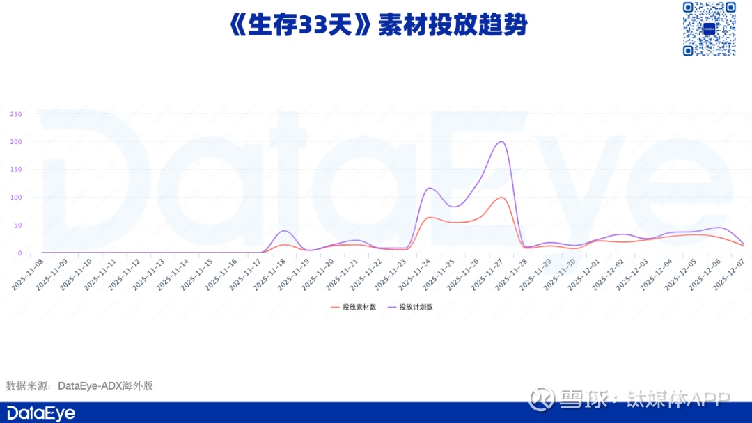 DataEye-ADX投放数据显示,《生存33天》在11月中旬开始进行效果广告投放,日均投放量不足100条。直到11月下旬,投放素材量有明显提升。