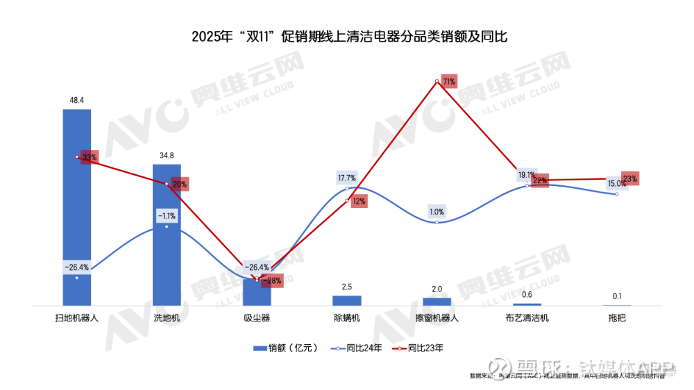 不过,需要认识到的是,全球扫地机的高速增长来自于新兴市场的刺激,国内市场的高速增长则主要归结于政策推动下的结果。一个明显的信号是,刚刚过去的双11,扫地机市场遭遇了销量下滑,并导致整个清洁电器的下降。奥维云网(AVC)线上监测数据显示,“双11”促销期,清洁电器整体零售额为95亿元,同比下滑17%;零售量为528万台,同比下滑1%。