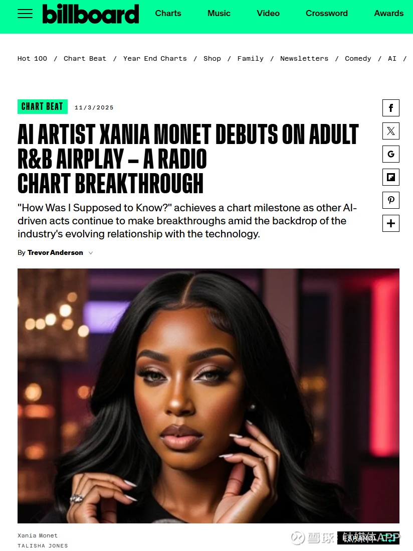 以音乐流媒体平台Spotify为例,Spotify Viral 50,即全球飙升榜前50名,在2025年11月内多次出现AI音乐,其中热门的《Walk My Walk》播放量超过640万。由美国诗人泰莉莎(Telisha Nikki Jones)利用AI音乐生成平台Suno创造的虚拟歌手Xania Monet,在Spotify上拥有超过120万听众,其热门曲目《How Was I Supposed to Know?》登上了美国知名音乐榜单Billboard。