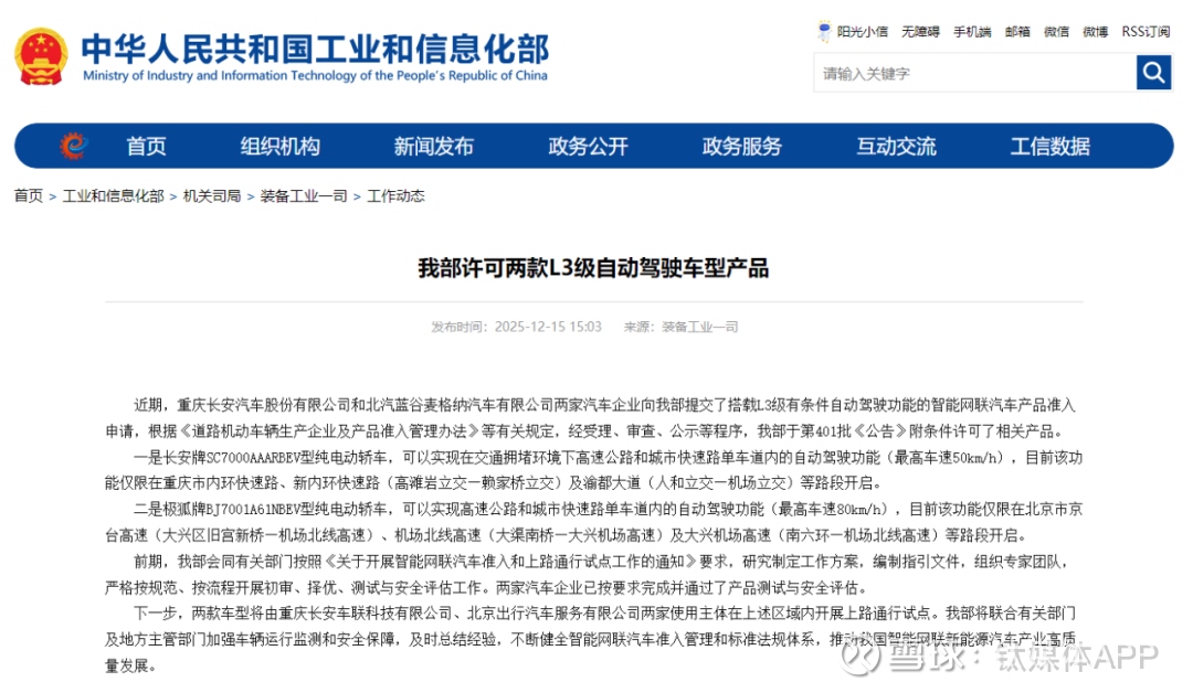 在同一时间轴的另一端,中国工业和信息化部正式批准了长安和极狐两款L3级自动驾驶车辆的上路试点,划定重庆和北京的特定区域作为测试场地。