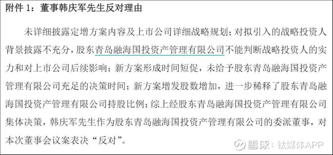 韩庆军系股东青岛融海国投资产管理有限公司(以下简称“融海资产”)委派董事,其反对理由明确指向本次定增方案的多重隐患:一是未充分披露战投背景及其实力,融海资产无法判断其对上市公司未来发展的实际影响;二是定增方案缺乏清晰的长期战略规划;三是新方案形成时间短促,未给予融海资产充足的决策时间;四是新增股份将进一步稀释融海资产的持股比例。