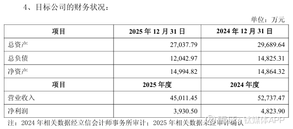 从经营情况看,标的公司具备连续盈利能力,但近两年业绩有所下滑。营收从2024年的5.27亿元降至2025年的4.5亿元,降幅14.6%;净利润从4823.9万元降至3930.5万元,降幅18.5%。净资产则相对稳定,2024-2025年所有者权益均维持在1.49亿元左右。