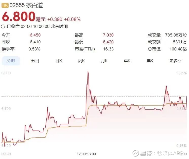 未来已来:茶饮行业新生存法则2月6日当天,港股茶饮板块应声大涨,其中古茗一度涨超5%创下上市以来新高,茶百道截至收盘涨超6%,而恒生指数仅微涨0.3%。